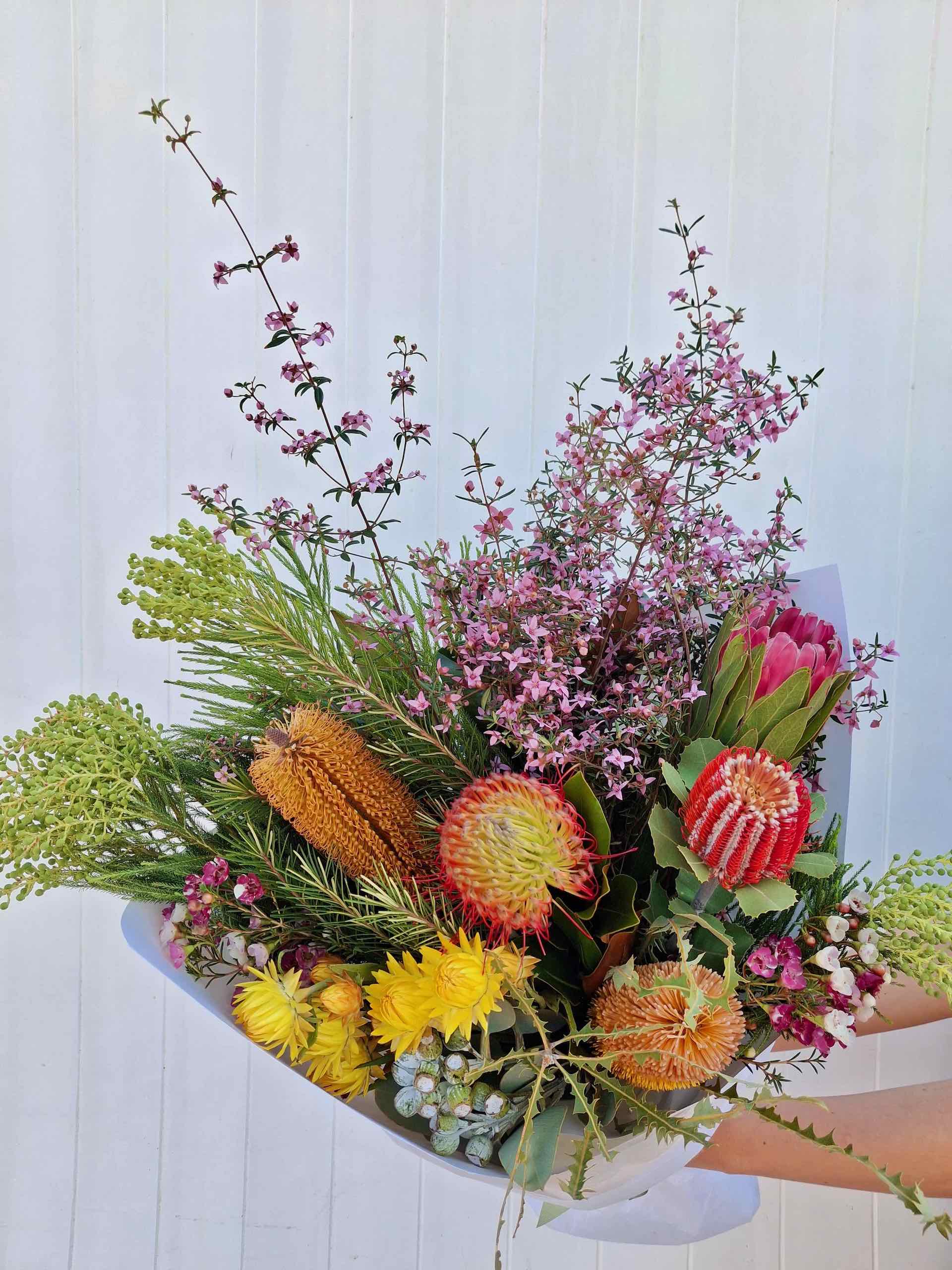 Our unique selection of seasonal wildflowers in a mix of Australian natives and South African flowers, foliage’s and textures. Images display different style variations. Final arrangements may vary due to season and selected budget. Thank you for understanding. Thank you for understanding.
